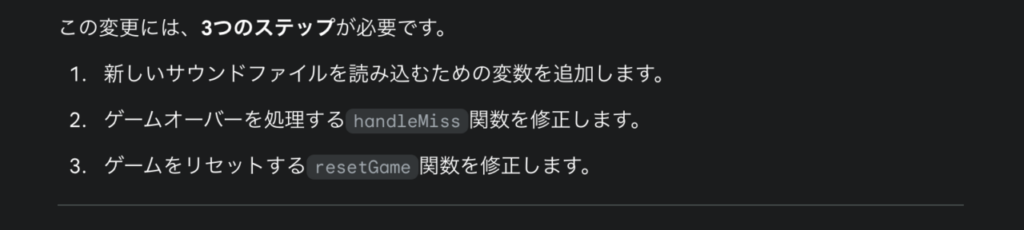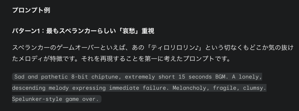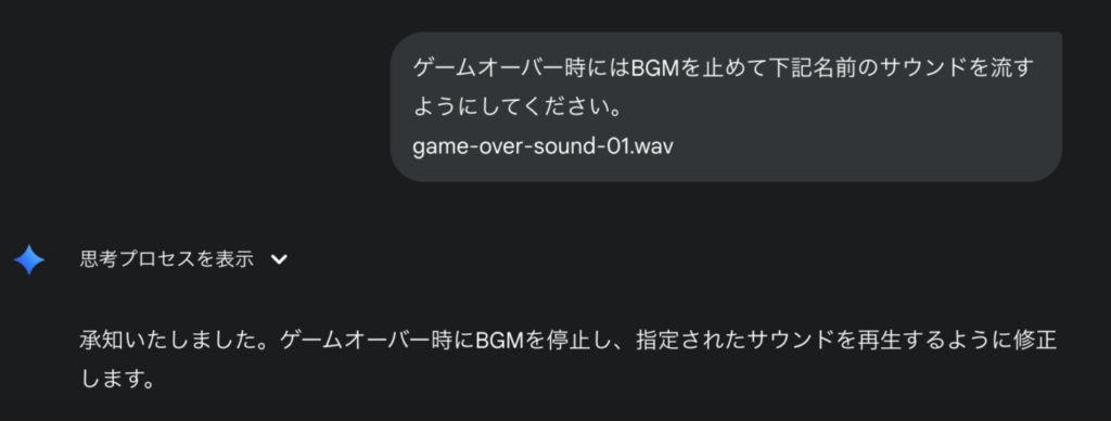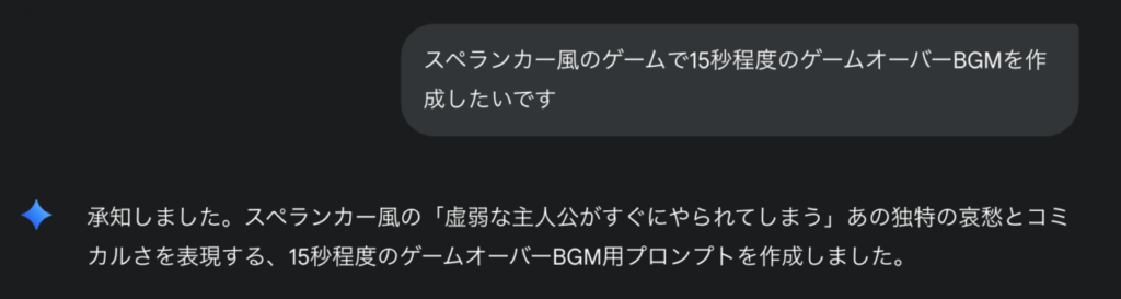サウンドやBGMを作るのは現在のGeminiでは難しそうなので、作成する際のプロンプトだけ作ってもらいます。